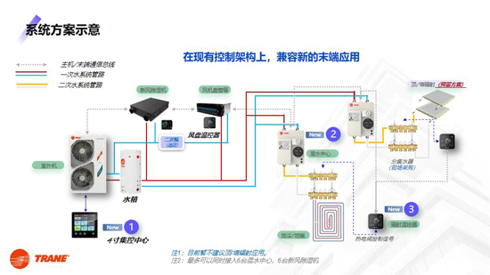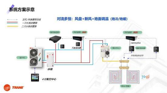 传统空气系统常陷入“一套方案用到底”的困境,客厅与卫生间需求不同却被迫共用一套设备,地下室潮湿问题始终难以根治。而特灵Transhome PRO多恒系统的核心突破,在于其 “自适应多末端组合”架构,如同搭积木般,将全空气系统、地面辐射调温、新风除湿、传统风机盘管四大功能模块灵活拆解,根据不同空间需求精准搭配,让每个区域都能拥有 “专属空气方案”。