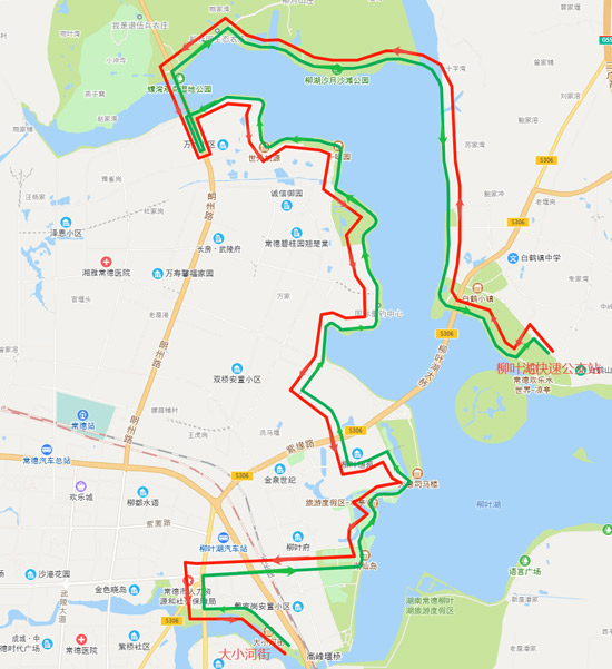 上行:大小河街、金凤川紫后大门、河街码头、河街西、常德电业局、常德日报社、天主教堂、柳叶湖游客集散中心、荷花公园、柳叶风帆、司马楼、复基小学、泉水路高丰路口、沾天湖停车场、柳叶湖国际垂钓中心、锦江酒店、车胤书屋、罗湾停车场、螺湾观鸟、沙滩公园、禾田居湖上园子、东岸栈桥停车场、欢乐水世界、柳叶湖快速公交站