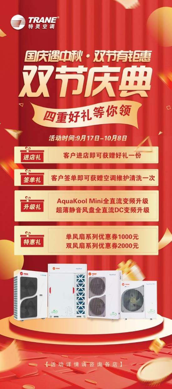 为回馈广大消费者,在双节期间,特灵空调V5系列推出四重好礼。进店礼,只要客户进店咨询,即可获赠精美礼品一份,感受特灵的贴心关怀。签到礼更是诚意满满,客户成功签单,就能获赠空调维护清洗一次,为空调的持久高效运行保驾护航。升级礼中,AquaKool Mini全直流变频可升级为超薄静音风盘全直流 DC变频,进一步提升室内舒适度。特惠礼,单风扇系列提供1000元优惠券,双风扇系列优惠券高达2000元,让消费者以更实惠的价格享受高端品质。