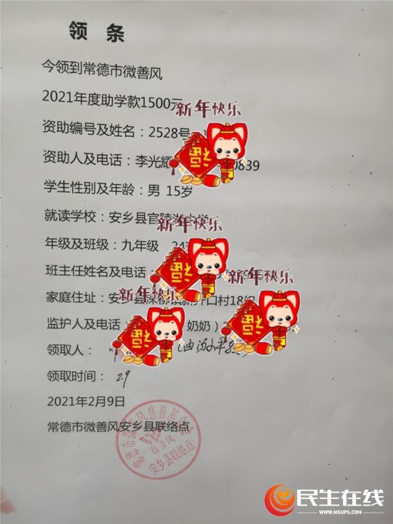 据悉,常德市微善风安乡县联络点是常德市微善风慈善基金会在安乡县设立的一个助学联络点,受安乡县妇联、安乡县教育局委托,自2016年以来,广泛联络爱心企业、爱心人士,2016年为安乡资助了528名特困学生。常德微善风慈善基金会,以“微博微信行微善,积少成多聚大爱”为理念,以“让天下没有失学的孩子”为愿景,以互联网为载体,利用微博微信等新型社交工具,发布贫困学生信息及劝募倡议,为热心助学的慈善人士,打通点对点全透明的捐助通道,线上线下同步运营,以期形成“慈善人人可为”的善德之风,帮助贫困学生,完成学业,帮助他们重塑理想,逆境成长。捐赠模式是,每年为小学生捐赠1200元,初中生1500元,高中生2000元,大学生3000元,至少资助三年或三年以上。自2016年常德市微善风吹到安乡以来,仅仅陈家嘴镇就资助了200多名特困学生,助学款达九十多万元。