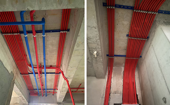 在电路方面,坚持“先埋管后穿线”的操作规范。弱电与强电均从配电箱引出,电线管分别以红色和蓝色区分,线管相交处应进行冷弯处理并向下开槽,强弱电相交处需包裹锡箔纸以防电磁干扰。线管转角处应采用大弧度弯管,确保电线可自由抽动,便于后期维修与更换;线路接头处必须使用专用接线端子,并进行绝缘处理,杜绝漏电隐患。
