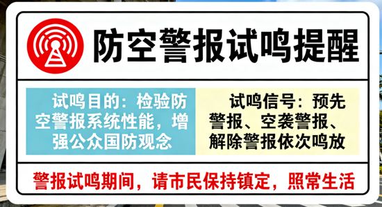 防空警报试鸣按照“预先警报”、“空袭警报”、“解除警报”的顺序进行,具体信号为:
