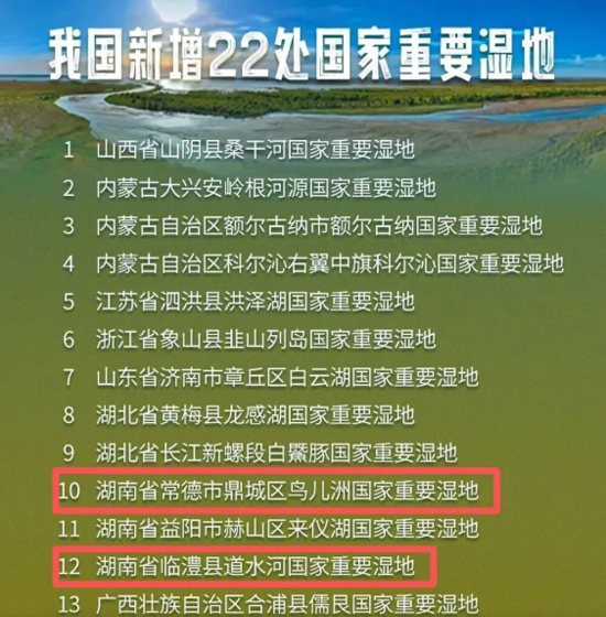 近日,国家林草局发布通知,将22处湿地列入国家重要湿地名录。其中,湖南省常德市鼎城区鸟儿洲国家重要湿地、湖南省临澧县道水河国家重要湿地2处入选。至此,我国国家重要湿地已达80处。