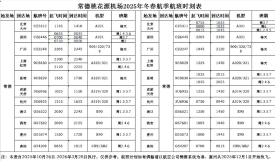 10月23日,常德桃花源机场发布信息:2025年10月26日至2026年3月28日,桃花源机场将执行冬春航季航班计划。